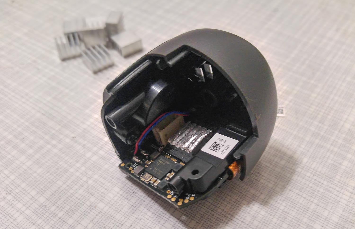 A view of the half-assembled head with the mainboard inside and the heatsink on the CPU. You should attach the head to the axis and attach the other side of the head to test if it still can be moved easily.